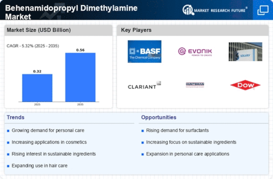 ベヘナミドプロピルジメチルアミン市場は、パーソナルケアおよび化粧品製品に対する需要の増加や、持続可能な成分への関心の高まりによって推進される動的な競争環境が特徴です。BASF SE(ドイツ)、エボニックインダストリーズAG(ドイツ)、およびクラリアントAG(スイス)などの主要企業は、広範な研究開発能力を活用して革新を進め、製品ラインを拡大するために戦略的に位置付けられています。これらの企業は、運営効率と持続可能性の向上に注力しており、これが相まって、エコフレンドリーなソリューションや高度な処方にますます向けられた競争環境を形成しています。