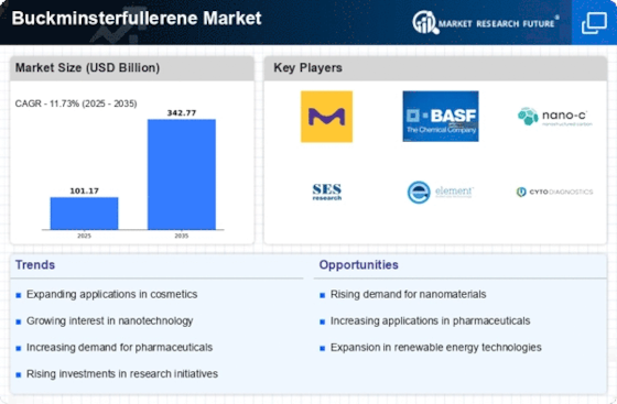 버크민스터풀러렌 시장은 나노기술, 재료 과학 및 제약 분야에서의 응용 증가에 의해 주도되는 역동적인 경쟁 환경이 특징입니다. Merck KGaA (DE), BASF SE (DE), Nano-C, Inc. (US)와 같은 주요 기업들이 선두에 서 있으며, 각기 다른 전략을 채택하여 시장 위치를 강화하고 있습니다. Merck KGaA (DE)는 혁신과 연구에 중점을 두고, 버크민스터풀러렌의 독특한 특성을 활용한 고급 재료 개발을 위해 R&D에 대규모로 투자하고 있습니다. 한편, BASF SE (DE)는 지속 가능성에 중점을 두고, 생산 과정에 친환경적인 관행을 통합하여 지속 가능한 재료에 대한 증가하는 수요와 잘 맞아떨어집니다. Nano-C, Inc. (US)는 다양한 산업에 맞춘 제품 포트폴리오를 전략적으로 확장하여 시장에서의 경쟁 우위를 강화하고 있습니다.