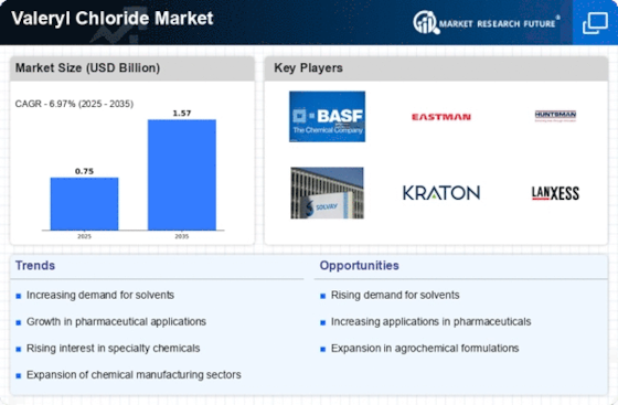 발레릴 클로라이드 시장은 현재 제약 및 농화학을 포함한 다양한 응용 분야에서 증가하는 수요에 의해 주도되는 역동적인 경쟁 환경으로 특징지어집니다. BASF SE(독일), 이스트만 화학 회사(미국), 헌츠맨 코퍼레이션(미국)과 같은 주요 기업들은 광범위한 제품 포트폴리오와 혁신적인 역량을 활용하기 위해 전략적으로 위치하고 있습니다. BASF SE(독일)는 지속 가능성과 디지털 혁신에 중점을 두어 운영 효율성을 향상시키고 환경 영향을 줄이는 것을 목표로 하고 있습니다. 한편, 이스트만 화학 회사(미국)는 맞춤형 솔루션으로의 증가하는 추세와 일치하는 특수 화학 제품의 혁신을 강조하고 있습니다. 헌츠맨 코퍼레이션(미국)은 발레릴 클로라이드 시장 파생물에 대한 수요 증가를 활용하기 위해 특히 신흥 시장에서 지역 확장을 적극적으로 추진하고 있습니다.