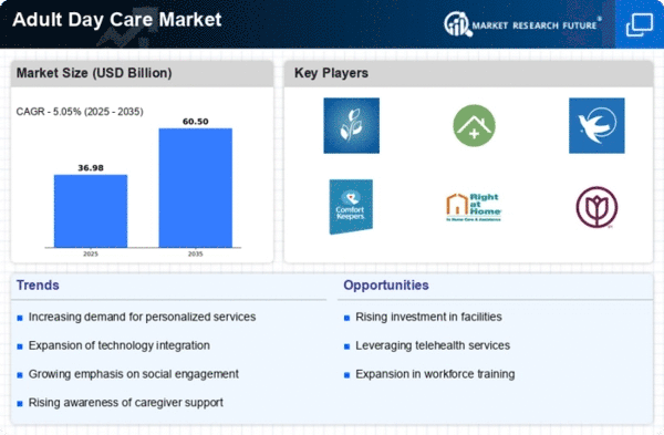The Middle East and Africa region is gradually developing its Adult Day Care market, with a market size of $2.9 billion in 2025. The growth is driven by increasing awareness of elder care needs, urbanization, and a shift towards community-based care models. Governments are beginning to recognize the importance of adult day care services in enhancing the quality of life for the elderly, leading to supportive policies and initiatives. The demand for these services is expected to rise as the population ages and family structures evolve. Countries such as South Africa and the UAE are at the forefront of this market development. The competitive landscape is still emerging, with a mix of local and international providers. Key players are focusing on establishing quality standards and innovative service delivery models to meet the growing demand. The emphasis on community engagement and culturally sensitive care solutions is crucial for the success of adult day care services in this region.