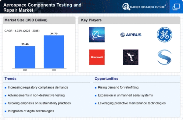 The Aerospace Components Testing and Repair Market is characterized by a dynamic competitive landscape, driven by technological advancements, regulatory compliance, and the increasing demand for efficient maintenance solutions. Major players such as Boeing (US), Airbus (FR), and General Electric (US) are strategically positioned to leverage their extensive experience and technological capabilities. Boeing (US) focuses on enhancing its testing capabilities through digital transformation initiatives, while Airbus (FR) emphasizes sustainability in its operations, aiming to reduce the environmental impact of its testing processes. General Electric (US) is investing heavily in AI and data analytics to optimize repair processes, thereby enhancing operational efficiency. Collectively, these strategies contribute to a competitive environment that prioritizes innovation and responsiveness to market demands.Key business tactics within the Aerospace Components Testing and Repair Market include localizing manufacturing and optimizing supply chains to enhance responsiveness and reduce costs. The market structure appears moderately fragmented, with several key players exerting significant influence. This fragmentation allows for niche players to thrive, while larger companies consolidate their positions through strategic partnerships and acquisitions, thereby shaping the competitive dynamics.