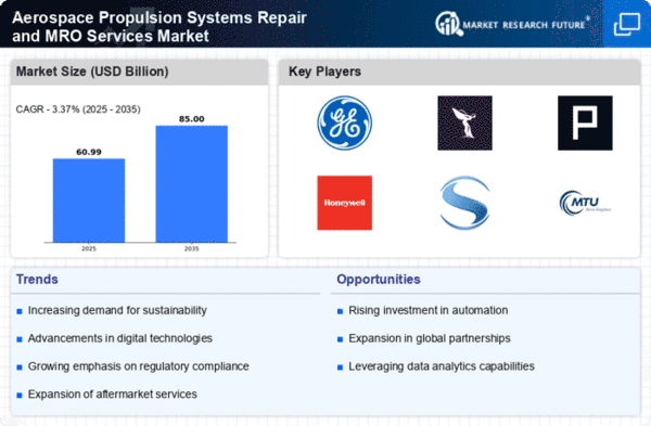 The Aerospace Propulsion Systems Repair and MRO Services Market is characterized by a dynamic competitive landscape, driven by technological advancements, increasing air traffic, and the growing demand for efficient maintenance solutions. Major players such as General Electric (US), Rolls-Royce (GB), and Pratt & Whitney (US) are strategically positioned to leverage their extensive experience and technological prowess. General Electric (US) focuses on digital transformation and predictive maintenance solutions, enhancing operational efficiency. Rolls-Royce (GB) emphasizes sustainability through its commitment to developing greener propulsion technologies, while Pratt & Whitney (US) invests in innovative repair techniques to reduce turnaround times and costs. Collectively, these strategies foster a competitive environment that prioritizes innovation and operational excellence.Key business tactics within the market include localizing manufacturing and optimizing supply chains to enhance responsiveness and reduce costs. The competitive structure appears moderately fragmented, with several key players exerting substantial influence. This fragmentation allows for niche players to thrive, while larger companies consolidate their market positions through strategic partnerships and technological advancements.