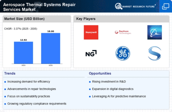 The Aerospace Thermal Systems Repair Services Market is characterized by a competitive landscape that is increasingly shaped by technological advancements and strategic collaborations. Key players such as Honeywell (US), Raytheon Technologies (US), and Rolls-Royce (GB) are actively pursuing innovation and digital transformation to enhance their service offerings. Honeywell (US) has focused on integrating advanced analytics into its repair services, which appears to improve efficiency and reduce turnaround times. Meanwhile, Raytheon Technologies (US) emphasizes partnerships with aerospace manufacturers to streamline supply chains and enhance service delivery, thereby positioning itself as a leader in the market. Collectively, these strategies indicate a shift towards a more integrated and technologically advanced service model, which is likely to redefine competitive dynamics in the sector.In terms of business tactics, companies are increasingly localizing manufacturing and optimizing supply chains to respond to regional demands more effectively. The market structure is moderately fragmented, with several key players exerting influence over specific segments. This fragmentation allows for niche players to thrive, while larger companies leverage their scale to optimize operations and enhance service capabilities. The collective influence of these key players fosters a competitive environment where innovation and operational efficiency are paramount.
