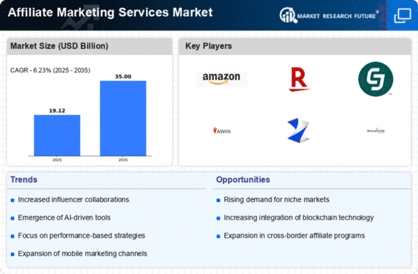 The Affiliate Marketing Services Market is currently characterized by a dynamic competitive landscape, driven by technological advancements and evolving consumer behaviors. Major players such as Amazon (US), CJ Affiliate (US), and Awin (DE) are at the forefront, each adopting distinct strategies to enhance their market positioning. Amazon (US) continues to leverage its vast e-commerce ecosystem, integrating affiliate marketing into its broader digital strategy, which appears to be focused on enhancing user engagement and driving sales through personalized marketing. Meanwhile, CJ Affiliate (US) emphasizes innovation in its affiliate technology, aiming to provide robust analytics and performance tracking tools that empower affiliates and advertisers alike. Awin (DE), on the other hand, is pursuing regional expansion, particularly in emerging markets, which suggests a strategic focus on diversifying its affiliate network and increasing its global footprint.The business tactics employed by these companies reflect a moderately fragmented market structure, where collaboration and competition coexist. Localizing services and optimizing supply chains are common strategies that enhance operational efficiency and responsiveness to market demands. The collective influence of these key players shapes a competitive environment that is increasingly reliant on technology and data-driven decision-making, indicating a shift towards more sophisticated affiliate marketing solutions.