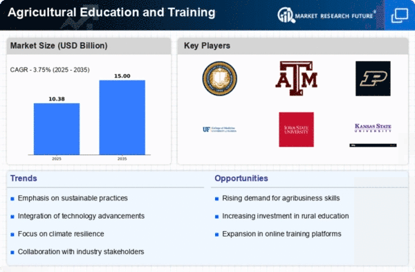 The Agricultural Education and Training market is characterized by a dynamic competitive landscape, driven by the increasing demand for skilled professionals in the agricultural sector. Key players are focusing on innovation, digital transformation, and strategic partnerships to enhance their educational offerings. For instance, the University of California (US) has been actively integrating technology into its curriculum, emphasizing precision agriculture and sustainable practices. Similarly, Texas A&M University (US) is leveraging its extensive research capabilities to foster collaborations with industry leaders, thereby enhancing its educational programs and outreach initiatives. These strategies collectively contribute to a competitive environment that prioritizes adaptability and relevance in a rapidly evolving agricultural landscape.In terms of business tactics, institutions are increasingly localizing their educational programs to meet regional agricultural needs, which appears to optimize their engagement with local communities. The market structure is moderately fragmented, with several universities and institutions competing for dominance. However, the influence of key players like Purdue University (US) and Iowa State University (US) is notable, as they continue to set benchmarks in curriculum development and research initiatives, thereby shaping the overall competitive dynamics.