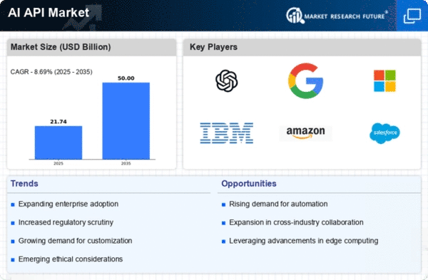 North America continues to dominate the AI API market, holding a significant share of 10.0 in 2025. The region's growth is driven by rapid technological advancements, increased investment in AI research, and a robust startup ecosystem. Regulatory support from government initiatives further catalyzes innovation, making it a fertile ground for AI development. The demand for AI solutions across various sectors, including healthcare and finance, is also on the rise, contributing to market expansion. The competitive landscape in North America is characterized by the presence of major players such as OpenAI, Google, and Microsoft. These companies are at the forefront of AI API development, leveraging their technological expertise and extensive resources. The U.S. remains the leading country, with a vibrant tech ecosystem that fosters collaboration between academia and industry. This synergy enhances the region's ability to innovate and maintain its leadership in The AI API.