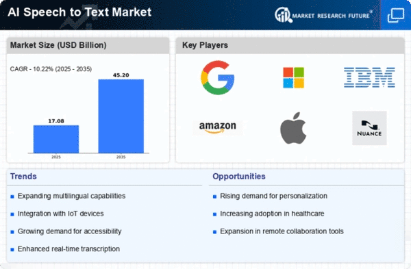 North America continues to dominate the AI speech to text market, holding a significant share of 7.75 in 2025. The region's growth is driven by rapid technological advancements, increasing demand for automation, and a strong focus on enhancing user experience across various sectors. Regulatory support for AI innovations further catalyzes market expansion, as businesses seek to integrate these solutions into their operations. The competitive landscape is robust, with key players like Google, Microsoft, and IBM leading the charge. The presence of major tech companies fosters an environment ripe for innovation, while startups also contribute to the dynamic market. The U.S. remains the frontrunner, leveraging its technological infrastructure and investment in AI research to maintain its leadership position in the global market.