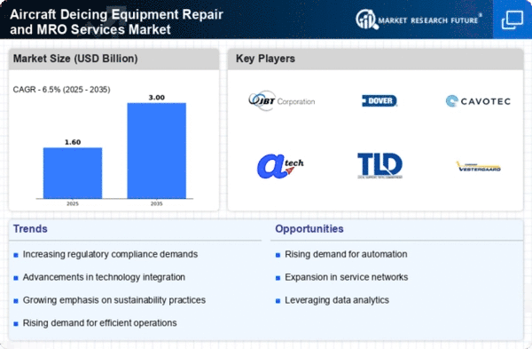 The Aircraft Deicing Equipment Repair and MRO Services Market is characterized by a competitive landscape that is increasingly shaped by innovation, strategic partnerships, and a focus on sustainability. Key players such as JBT Corporation (US), Dover Corporation (US), and Cavotec SA (CH) are actively positioning themselves to leverage technological advancements and enhance operational efficiencies. JBT Corporation (US) has been particularly focused on expanding its product offerings through innovative deicing solutions, while Dover Corporation (US) emphasizes its commitment to sustainability by integrating eco-friendly practices into its operations. Cavotec SA (CH) appears to be enhancing its market presence through strategic collaborations aimed at improving service delivery and customer satisfaction, collectively shaping a competitive environment that prioritizes technological integration and environmental responsibility.In terms of business tactics, companies are increasingly localizing manufacturing and optimizing supply chains to enhance responsiveness to market demands. The market structure is moderately fragmented, with several key players exerting influence over various segments. This fragmentation allows for a diverse range of services and products, fostering competition that drives innovation and efficiency. The collective influence of these key players is significant, as they set industry standards and push for advancements in deicing technologies and MRO services.