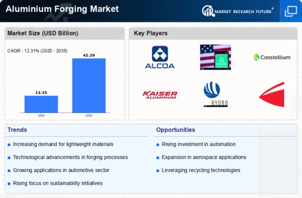 The Aluminium Forging Market is characterized by a dynamic competitive landscape, driven by increasing demand across various sectors such as automotive, aerospace, and construction. Key players are actively pursuing strategies that emphasize innovation, operational efficiency, and sustainability. For instance, Alcoa Corporation (US) has been focusing on enhancing its product offerings through advanced manufacturing techniques, while Constellium SE (FR) is leveraging its expertise in lightweight materials to cater to the growing electric vehicle market. These strategic positions not only bolster their market presence but also contribute to a more competitive environment, as companies strive to differentiate themselves through technological advancements and sustainable practices.