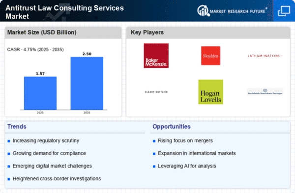 The Antitrust Law Consulting Services Market is characterized by a dynamic competitive landscape, driven by increasing regulatory scrutiny and the need for compliance among corporations globally. Key players such as Baker McKenzie (US), Skadden, Arps, Slate, Meagher & Flom LLP (US), and Freshfields Bruckhaus Deringer (GB) are strategically positioned to leverage their extensive legal expertise and global reach. These firms focus on innovation in legal practices, enhancing their service offerings through technology integration and data analytics, which collectively shapes a competitive environment that is increasingly reliant on sophisticated legal solutions.The market structure appears moderately fragmented, with a mix of large multinational firms and specialized boutique consultancies. Key players employ various business tactics, including localizing their services to meet regional regulatory requirements and optimizing their operational frameworks to enhance client engagement. This collective influence of major firms fosters a competitive atmosphere where adaptability and responsiveness to regulatory changes are paramount.