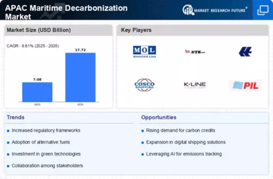 Japan holds a 1.0% share in the APAC Maritime Decarbonization Market, characterized by its strong emphasis on technological innovation. The country is a leader in developing advanced marine technologies, including hydrogen fuel cells and energy-efficient vessels. Government initiatives, such as the Green Growth Strategy, are pivotal in driving demand for sustainable shipping solutions. Major ports like Tokyo and Yokohama are investing in green infrastructure, enhancing Japan's competitive edge in the maritime sector.