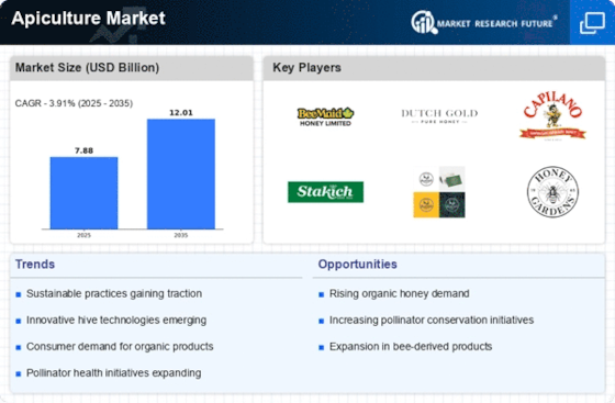 The Apiculture Market is significantly influenced by the rising awareness of pollinator decline and its implications for food security. As studies highlight the critical role of bees in pollination, there is a growing movement to protect and support bee populations. Initiatives aimed at promoting sustainable agricultural practices and habitat conservation are gaining traction, which could lead to increased investments in the Apiculture Market. In 2023, various organizations reported a 30% decline in bee populations in certain regions, prompting urgent action. This heightened awareness may drive consumer demand for honey and other bee-related products, thereby benefiting the industry.