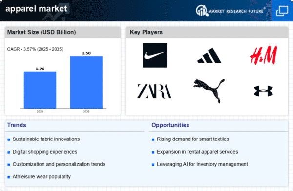 The apparel market is currently characterized by a dynamic competitive landscape, driven by innovation, sustainability, and digital transformation. Major players such as Nike (US), Adidas (DE), and H&M (SE) are actively reshaping their strategies to maintain market relevance. Nike (US) continues to emphasize its commitment to sustainability, focusing on eco-friendly materials and production processes, while Adidas (DE) is leveraging its strong brand heritage to enhance its digital presence and consumer engagement. H&M (SE), on the other hand, is prioritizing circular fashion initiatives, aiming to reduce waste and promote recycling within its supply chain. Collectively, these strategies not only enhance brand loyalty but also intensify competition as companies strive to differentiate themselves in a crowded marketplace.Key business tactics within the apparel market include localizing manufacturing and optimizing supply chains to enhance efficiency and responsiveness. The market structure appears moderately fragmented, with a mix of established brands and emerging players. The influence of key players is substantial, as their strategic decisions often set industry benchmarks, compelling others to adapt or innovate in response.