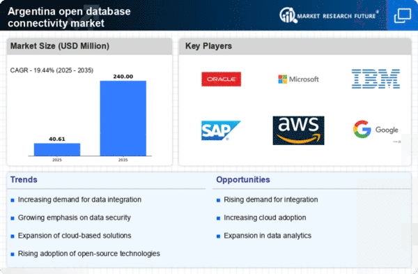 The Argentine government is actively promoting digital transformation initiatives, which are positively impacting the open database-connectivity market. Policies aimed at enhancing technological infrastructure and fostering innovation are encouraging businesses to adopt modern data management practices. For instance, government funding programs have been established to support technology adoption, with an estimated investment of $500 million allocated for digital projects in 2025. This financial backing is likely to stimulate growth in the open database-connectivity market, as organizations seek to comply with new regulations and improve their data connectivity capabilities. As digital transformation becomes a national priority, the demand for open database connectivity solutions is expected to increase, driving market expansion and technological advancements.
