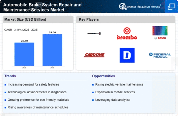 Europe's market for Automobile Brake System Repair and Maintenance Services is valued at 7.5, reflecting a growing demand driven by increasing vehicle regulations and a shift towards electric vehicles. The region is witnessing a rise in consumer awareness regarding vehicle safety, which is propelling the need for regular maintenance services. Additionally, government initiatives aimed at reducing emissions are influencing the market positively.