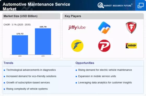 The Automotive Maintenance Service Market is characterized by a competitive landscape that is increasingly shaped by innovation, digital transformation, and strategic partnerships. Key players such as Jiffy Lube (US), Midas (US), and Firestone Complete Auto Care (US) are actively pursuing strategies that enhance their service offerings and operational efficiencies. Jiffy Lube (US), for instance, has focused on expanding its service portfolio to include advanced vehicle diagnostics, which positions it favorably in a market that demands more comprehensive maintenance solutions. Similarly, Midas (US) has been investing in technology-driven customer engagement platforms, which not only streamline service appointments but also enhance customer loyalty through personalized experiences. These strategic initiatives collectively contribute to a competitive environment that is increasingly reliant on technological advancements and customer-centric approaches.The business tactics employed by these companies reflect a moderately fragmented market structure, where local players coexist with larger chains. Companies are localizing their service offerings to cater to regional preferences, which is crucial in a market where consumer expectations vary significantly. Supply chain optimization has also emerged as a critical tactic, particularly in light of rising operational costs. The collective influence of these key players is shaping a market that is responsive to both consumer demands and operational efficiencies, thereby fostering a dynamic competitive landscape.