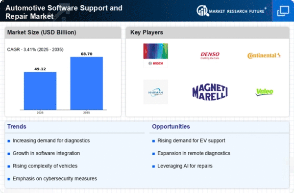 Europe is emerging as a vital hub for the Automotive Software Support and Repair Market, with a market size of 12.5 in 2024. The region's growth is fueled by increasing investments in electric vehicles (EVs) and stringent EU regulations aimed at reducing carbon emissions. The demand for advanced software solutions is rising, driven by the need for enhanced vehicle connectivity and safety features, aligning with the EU's Green Deal objectives.
