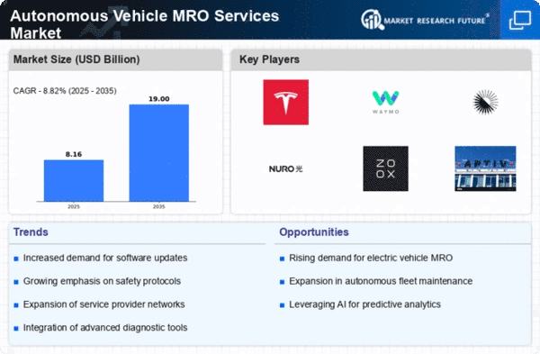 The Autonomous Vehicle MRO Services Market is currently characterized by a dynamic competitive landscape, driven by rapid technological advancements and increasing demand for efficient maintenance solutions. Key players such as Tesla (US), Waymo (US), and Mobileye (IL) are at the forefront, each adopting distinct strategies to enhance their market positioning. Tesla (US) continues to innovate with its proprietary software updates, which streamline maintenance processes and reduce downtime. Meanwhile, Waymo (US) focuses on strategic partnerships with local municipalities to expand its service networks, thereby enhancing operational efficiency and customer reach. Mobileye (IL), on the other hand, emphasizes the integration of advanced AI technologies into its MRO services, which not only improves safety but also optimizes maintenance schedules.The business tactics employed by these companies reflect a broader trend towards localization and supply chain optimization. The market appears moderately fragmented, with several players vying for dominance. However, the collective influence of major companies is significant, as they set benchmarks for service quality and technological innovation. This competitive structure fosters an environment where continuous improvement and adaptation are essential for survival.
