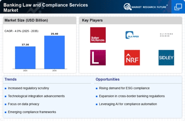 The Banking Law and Compliance Services Market is characterized by a dynamic competitive landscape, driven by regulatory complexities and the increasing need for compliance in a rapidly evolving financial environment. Key players such as Baker McKenzie (US), DLA Piper (US), and Linklaters (GB) are strategically positioned to leverage their extensive legal expertise and global reach. Baker McKenzie (US) focuses on digital transformation initiatives, enhancing its service delivery through technology integration, while DLA Piper (US) emphasizes regional expansion, particularly in emerging markets, to capture new client segments. Linklaters (GB) appears to prioritize innovation in compliance solutions, which collectively shapes a competitive environment that is increasingly reliant on technological advancements and strategic partnerships.The market structure is moderately fragmented, with a mix of large multinational firms and specialized boutique firms. Key players employ various business tactics, such as localizing services to meet regional regulatory requirements and optimizing their operational frameworks to enhance efficiency. This collective influence of major firms fosters a competitive atmosphere where agility and responsiveness to regulatory changes are paramount.