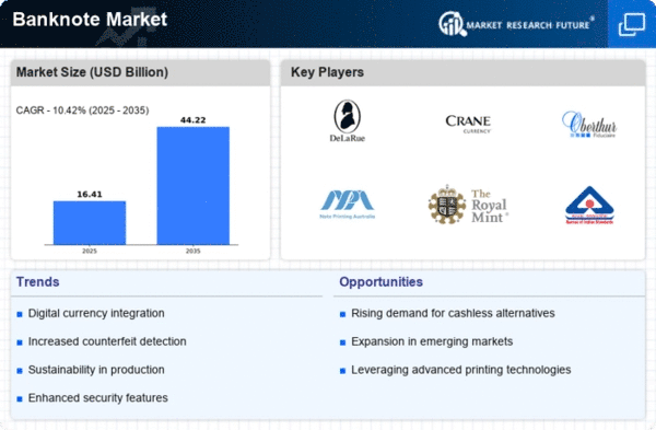 The Banknote Market is characterized by a competitive landscape that is increasingly shaped by technological advancements and evolving consumer demands. Key players such as De La Rue (GB), Giesecke+Devrient (DE), and Crane Currency (US) are at the forefront, each adopting distinct strategies to enhance their market positioning. De La Rue (GB) has focused on innovation, particularly in the realm of polymer banknotes, which are gaining traction due to their durability and security features. Meanwhile, Giesecke+Devrient (DE) emphasizes regional expansion, particularly in emerging markets, where the demand for secure currency solutions is on the rise. Crane Currency (US) is leveraging partnerships with governments to integrate advanced security features into their banknotes, thereby enhancing their competitive edge.The business tactics employed by these companies reflect a concerted effort to optimize supply chains and localize manufacturing processes. The market structure appears moderately fragmented, with several players vying for market share, yet the influence of major companies remains substantial. This competitive dynamic fosters an environment where innovation and operational efficiency are paramount, as companies strive to differentiate themselves in a crowded marketplace.