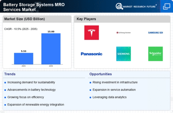The Battery Storage Systems MRO Services Market is currently characterized by a dynamic competitive landscape, driven by the increasing demand for energy storage solutions and the transition towards renewable energy sources. Key players such as Tesla (US), LG Energy Solution (KR), and Siemens (DE) are strategically positioning themselves through innovation and partnerships. Tesla (US) focuses on enhancing its battery technology and expanding its service network, while LG Energy Solution (KR) emphasizes sustainable practices and regional expansion to meet growing global demand. Siemens (DE) leverages its expertise in digital transformation to optimize operations, thereby shaping a competitive environment that prioritizes technological advancement and sustainability.In terms of business tactics, companies are increasingly localizing manufacturing and optimizing supply chains to enhance efficiency and reduce costs. The market appears moderately fragmented, with several key players exerting considerable influence. This structure allows for a diverse range of services and innovations, fostering competition that drives improvements in battery storage systems and MRO services.