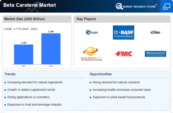 The Beta Carotene Market is experiencing a notable surge in demand for natural colorants, driven by a growing consumer preference for clean label products. As food manufacturers seek to replace synthetic additives with natural alternatives, beta carotene emerges as a favored choice due to its vibrant hue and health benefits. The market for natural colorants is projected to expand significantly, with estimates suggesting a compound annual growth rate of over 5% in the coming years. This trend aligns with the broader movement towards healthier eating habits, where consumers are increasingly scrutinizing ingredient lists. Consequently, the Beta Carotene Market stands to benefit from this shift, as more companies incorporate beta carotene into their formulations to meet consumer expectations.