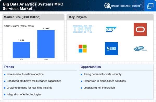 The Big Data Analytics Systems MRO Services Market is currently characterized by a dynamic competitive landscape, driven by the increasing demand for data-driven decision-making and operational efficiency across various industries. Key players such as IBM (US), SAP (DE), and Oracle (US) are at the forefront, leveraging their technological prowess to enhance service offerings. IBM (US) focuses on integrating AI capabilities into its analytics solutions, thereby enabling predictive maintenance and operational insights. SAP (DE) emphasizes cloud-based solutions, facilitating real-time data access and collaboration, which is crucial for MRO services. Oracle (US) is strategically positioning itself through acquisitions, enhancing its analytics portfolio to cater to the evolving needs of the market. Collectively, these strategies foster a competitive environment that prioritizes innovation and technological advancement.In terms of business tactics, companies are increasingly localizing their operations to better serve regional markets, optimizing supply chains to enhance efficiency. The market structure appears moderately fragmented, with several players vying for market share. However, the influence of major companies is substantial, as they set benchmarks for technological advancements and service quality. This competitive structure encourages smaller firms to innovate and differentiate their offerings, thereby contributing to a vibrant market ecosystem.