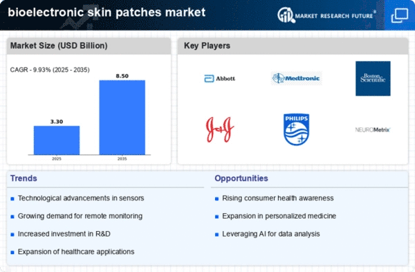 The bioelectronic skin patches Market is currently characterized by a dynamic competitive landscape, driven by technological advancements and increasing demand for non-invasive health monitoring solutions. Key players such as Abbott Laboratories (US), Medtronic (US), and Johnson & Johnson (US) are at the forefront, focusing on innovation and strategic partnerships to enhance their market presence. Abbott Laboratories (US) has been particularly active in expanding its product portfolio, emphasizing the integration of advanced biosensors into its skin patch technology, which positions it favorably against competitors. Meanwhile, Medtronic (US) is leveraging its extensive experience in medical devices to develop bioelectronic patches that cater to chronic disease management, thereby addressing a significant market need.