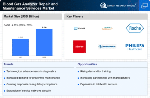 The Blood Gas Analyzer Repair and Maintenance Services Market is characterized by a competitive landscape that is increasingly shaped by technological advancements and strategic collaborations. Key players such as Abbott Laboratories (US), Siemens Healthineers (DE), and Roche Diagnostics (CH) are actively pursuing innovation and digital transformation to enhance service delivery and operational efficiency. These companies are not only focusing on expanding their service portfolios but are also investing in partnerships that leverage cutting-edge technologies, thereby fostering a more integrated approach to maintenance and repair services. This collective emphasis on innovation and strategic positioning appears to be driving a more dynamic competitive environment, where agility and responsiveness to market demands are paramount.In terms of business tactics, companies are increasingly localizing manufacturing and optimizing supply chains to enhance service responsiveness and reduce operational costs. The market structure is moderately fragmented, with several players vying for market share, yet the influence of major companies remains substantial. This competitive structure allows for a diverse range of service offerings, catering to various customer needs while also fostering a climate of innovation as companies strive to differentiate themselves.