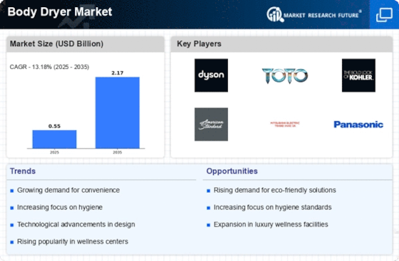 Technological advancements are playing a pivotal role in shaping the Body Dryer Market. Innovations such as improved heating elements, energy-efficient designs, and user-friendly interfaces are enhancing the functionality and appeal of body dryers. Manufacturers are increasingly integrating smart technology, allowing users to customize drying settings based on their preferences. This trend is likely to attract tech-savvy consumers who value convenience and efficiency. Furthermore, the introduction of features like automatic sensors and adjustable airflow is expected to drive market growth. As the industry evolves, the incorporation of advanced technology may lead to a more competitive landscape, compelling companies to invest in research and development to stay ahead.