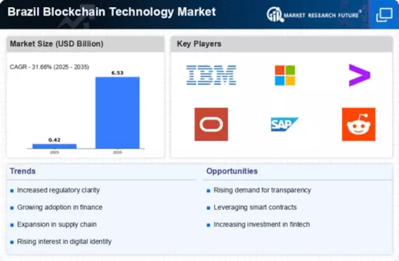 The Brazil Blockchain Technology Market is significantly influenced by the rising demand for transparency and security in various sectors. As businesses and consumers become increasingly aware of data breaches and fraud, the immutable nature of blockchain technology offers a compelling solution. Industries such as supply chain management and healthcare are exploring blockchain to enhance traceability and secure sensitive information. For instance, Brazilian companies are implementing blockchain to track the provenance of agricultural products, ensuring quality and safety. This trend suggests that the demand for secure and transparent systems will likely propel the adoption of blockchain technology across multiple sectors in Brazil.