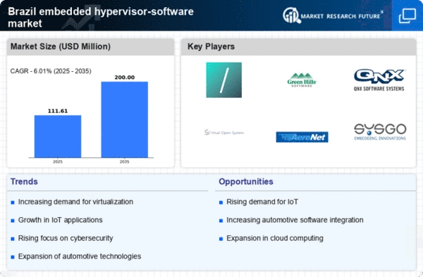 The proliferation of smart devices in Brazil is driving the embedded hypervisor-software market. As consumers and businesses increasingly rely on smart technologies, the need for efficient virtualization solutions becomes paramount. This trend is evident in sectors such as healthcare, automotive, and consumer electronics, where smart devices require robust software to manage multiple operating systems. The embedded hypervisor-software market is projected to grow at a CAGR of 15% in Brazil, reflecting the rising demand for seamless integration and performance optimization in smart devices. Companies are investing in advanced hypervisor solutions to enhance device capabilities, thereby fostering innovation and improving user experiences. This increased adoption of smart devices is likely to continue influencing the market dynamics, as manufacturers seek to leverage virtualization for better resource management and operational efficiency.