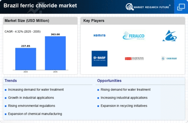 The competitive dynamics of the ferric chloride market in Brazil exhibit a landscape characterized by both established players and emerging contenders. Key growth drivers include increasing demand from water treatment facilities and the electronics sector, which necessitates high-purity ferric chloride. Major companies such as Kemira (FI), BASF (DE), and Chemtrade Logistics (CA) are strategically positioned to leverage their extensive operational capabilities. Kemira (FI) focuses on innovation in sustainable solutions, while BASF (DE) emphasizes digital transformation to enhance operational efficiency. Chemtrade Logistics (CA) is actively pursuing regional expansion to capture growing market segments, collectively shaping a competitive environment that is increasingly focused on sustainability and technological advancement.In terms of business tactics, localizing manufacturing and optimizing supply chains are pivotal strategies employed by these companies. The market structure appears moderately fragmented, with a mix of large multinational corporations and smaller regional players. This fragmentation allows for a diverse range of offerings, yet the collective influence of key players like PVS Chemicals (US) and Hawkins (US) ensures that competition remains robust, driving innovation and efficiency across the sector.