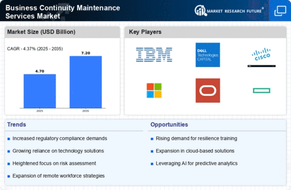The Business Continuity Maintenance Services Market is experiencing a surge in demand due to increasing regulatory compliance requirements across various sectors. Organizations are compelled to adhere to stringent regulations that mandate the establishment of robust business continuity plans. This trend is particularly evident in industries such as finance, healthcare, and telecommunications, where regulatory bodies impose strict guidelines to ensure operational resilience. As a result, companies are investing in business continuity maintenance services to meet these compliance standards, thereby driving market growth. The market is projected to expand as organizations recognize the necessity of aligning their operations with regulatory frameworks, which not only mitigates risks but also enhances their reputation in the marketplace.