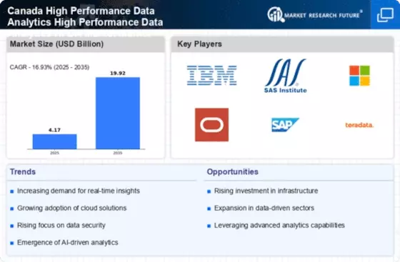 The Canada High Performance Data Analytics The Canada High Performance Data Analytics HPDA Market Industry is experiencing a notable surge in demand for real-time analytics. Market is experiencing a notable surge in demand for real-time analytics. Organizations across various sectors, including finance, healthcare, and retail, are increasingly relying on real-time data insights to enhance decision-making processes. According to recent statistics, the market for real-time analytics in Canada is projected to grow at a compound annual growth rate (CAGR) of approximately 25% over the next five years. This growth is driven by the need for businesses to respond swiftly to market changes and customer preferences. As a result, companies are investing in high-performance data analytics solutions that can process vast amounts of data in real-time, thereby improving operational efficiency and customer satisfaction.