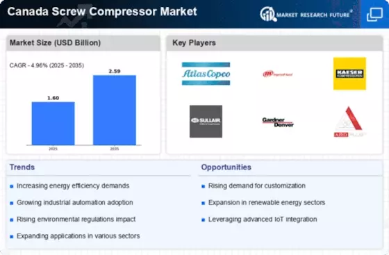 The expansion of the manufacturing sector in Canada significantly influences the Canada Screw Compressor Market. With a robust manufacturing base, particularly in automotive, aerospace, and food processing, the demand for reliable and efficient compressed air systems is increasing. Recent statistics indicate that the manufacturing sector contributes approximately 10% to Canada's GDP, highlighting its importance. As manufacturers seek to optimize production processes, the need for high-performance screw compressors becomes paramount. This growth trajectory suggests a sustained demand for innovative compressor solutions that can meet the evolving needs of the manufacturing landscape.