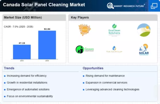 The Canada Solar Panel Cleaning Market is benefiting from advancements in cleaning technology. Innovations such as automated cleaning robots and eco-friendly cleaning solutions are becoming increasingly prevalent. These technologies not only improve the efficiency of cleaning processes but also reduce water usage, which is particularly relevant in regions facing water scarcity. For instance, some cleaning systems utilize minimal water while effectively removing dirt and grime, making them attractive to environmentally conscious consumers. The integration of technology in cleaning services is likely to enhance service offerings, leading to increased customer satisfaction and loyalty. As a result, companies that adopt these innovations may gain a competitive edge in the growing market for solar panel cleaning.