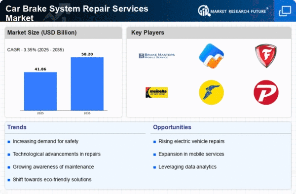 The Car Brake System Repair Services Market is characterized by a competitive landscape that is increasingly shaped by innovation, customer-centric strategies, and technological advancements. Key players such as Brake Masters (US), Midas (US), and Firestone Complete Auto Care (US) are actively redefining their operational focus to enhance service delivery and customer satisfaction. For instance, Brake Masters (US) has been investing in advanced diagnostic tools to improve service efficiency, while Midas (US) emphasizes a customer-first approach, integrating feedback mechanisms to refine their offerings. Firestone Complete Auto Care (US) is also notable for its commitment to sustainability, implementing eco-friendly practices in its repair processes. Collectively, these strategies not only enhance individual company positioning but also intensify competition within the market, pushing other players to innovate and adapt.The business tactics employed by these companies reflect a nuanced understanding of market dynamics. Localizing service offerings and optimizing supply chains are prevalent strategies aimed at reducing operational costs and improving service delivery times. The market structure appears moderately fragmented, with a mix of large chains and independent operators. However, the influence of major players like Goodyear Auto Service (US) and Pep Boys (US) is substantial, as they leverage their extensive networks to dominate market share and set service standards.
