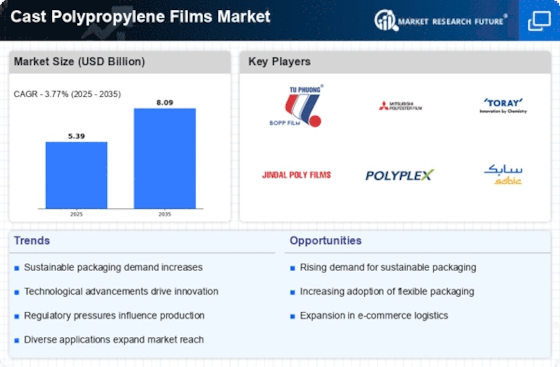 Technological advancements in film production processes are significantly shaping the Cast Polypropylene Films Market. Innovations such as improved extrusion techniques and enhanced polymer formulations are leading to the development of films with superior properties, including increased strength and flexibility. These advancements not only enhance the performance of cast polypropylene films but also contribute to cost efficiencies in production. As manufacturers adopt these new technologies, they are likely to produce higher-quality films that meet the diverse needs of various applications, from packaging to industrial uses. The ongoing evolution in production technology suggests that the Cast Polypropylene Films Market will continue to evolve, potentially leading to new product offerings and expanded market opportunities.