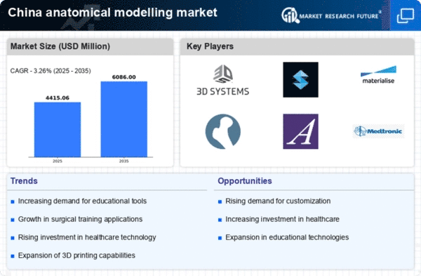 The integration of advanced technologies in healthcare is a key driver for the anatomical modelling market in China. Innovations such as 3D printing and virtual reality are transforming the way anatomical models are created and utilized. In 2025, the market for 3D printing in healthcare is expected to reach $2 billion, indicating a robust growth trajectory. This technological evolution allows for the production of highly detailed and customized anatomical models, catering to specific surgical needs. As healthcare providers increasingly adopt these technologies, the anatomical modelling market is likely to see a corresponding increase in demand for innovative modelling solutions.