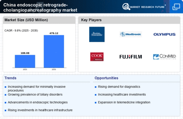 The rising healthcare expenditure in China is a pivotal driver for the endoscopic retrograde-cholangiopancreatography market. As the government allocates more funds towards healthcare, hospitals and clinics are increasingly investing in advanced medical technologies. In 2025, healthcare spending in China is projected to reach approximately $1 trillion, reflecting a growth rate of around 10% annually. This financial commitment enables healthcare facilities to acquire state-of-the-art endoscopic equipment, thereby enhancing diagnostic and therapeutic capabilities. Furthermore, the emphasis on improving healthcare infrastructure supports the adoption of endoscopic retrograde-cholangiopancreatography procedures, which are essential for diagnosing and treating biliary and pancreatic disorders. Consequently, the endoscopic retrograde-cholangiopancreatography market is likely to experience substantial growth as healthcare providers seek to offer high-quality services to patients.