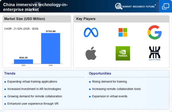 Technological advancements in hardware and software are significantly influencing the immersive technology-in-enterprise market in China. The development of more powerful and affordable VR headsets, along with sophisticated software platforms, is enabling enterprises to implement immersive solutions more effectively. For instance, the introduction of 5G technology is expected to enhance the performance of immersive applications, allowing for seamless experiences. This is particularly relevant in sectors such as manufacturing and healthcare, where immersive training and simulations can lead to improved outcomes. The overall investment in immersive technology is anticipated to exceed $15 billion by 2025, underscoring the importance of these advancements in shaping the market.