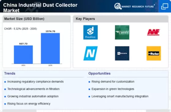 The China Industrial Dust Collector Market Industry is experiencing a notable surge due to stringent regulatory frameworks aimed at reducing air pollution. The government has implemented various policies that mandate industries to adopt effective dust control measures. For instance, the Ministry of Ecology and Environment has set forth guidelines that require manufacturers to comply with emission standards. This regulatory pressure is compelling companies to invest in advanced dust collection systems, thereby driving market growth. In 2025, the market was valued at approximately USD 1.5 billion, reflecting a compound annual growth rate of around 8% over the previous five years. As industries strive to meet these regulations, the demand for efficient dust collectors is likely to increase, further propelling the China Industrial Dust Collector Market Industry.