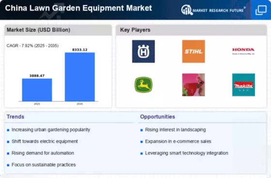 The growing interest in sustainable gardening practices is a crucial driver for the China Lawn Garden Equipment Market. As environmental awareness increases, consumers are more inclined to adopt eco-friendly gardening methods, which in turn drives demand for sustainable lawn and garden equipment. This shift is evidenced by a rise in sales of organic fertilizers and biodegradable gardening tools, which have gained traction among environmentally conscious consumers. Market data indicates that the segment for sustainable gardening products is expected to grow by 12% annually, reflecting a broader trend towards sustainability in consumer behavior. This growing interest presents opportunities for manufacturers to develop innovative products that align with eco-friendly practices.