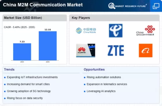 The push towards smart city initiatives in China is a pivotal driver for the China M2M Communication Market. As urbanization accelerates, cities are increasingly adopting M2M communication technologies to enhance infrastructure efficiency, public safety, and resource management. For instance, the Chinese government has allocated substantial funding to develop smart city projects, which are expected to integrate M2M solutions for traffic management, waste management, and energy efficiency. By 2025, it is projected that over 500 cities in China will implement smart city frameworks, significantly boosting the demand for M2M communication services. This trend not only fosters innovation but also creates a robust ecosystem for M2M providers, indicating a promising growth trajectory for the industry.