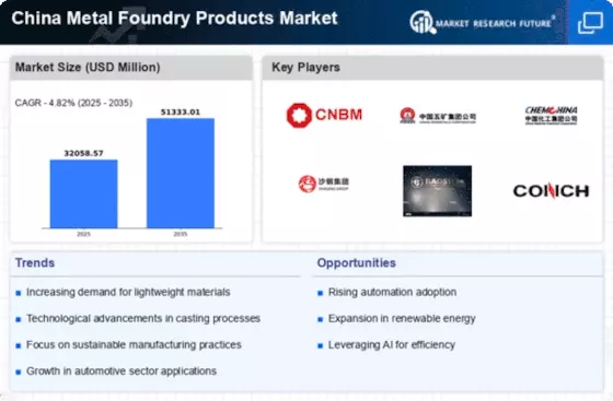 The automotive sector in China is experiencing robust growth, which significantly influences the China Metal Foundry Products Market. As of 2025, the automotive industry is projected to reach a market size of approximately 4 trillion yuan, driving the demand for metal foundry products used in vehicle manufacturing. Components such as engine blocks, transmission cases, and chassis parts are increasingly sourced from foundries. This trend is further supported by the shift towards electric vehicles, which require specialized metal components. Consequently, the China Metal Foundry Products Market is likely to benefit from this surge in demand, as foundries adapt to produce lightweight and high-strength materials essential for modern vehicles.