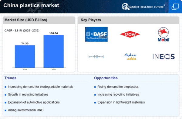 The plastics market in China is characterized by a dynamic competitive landscape, driven by increasing demand across various sectors, including automotive, packaging, and construction. Key players such as BASF SE (Germany), Dow Inc. (US), and SABIC (Saudi Arabia) are actively shaping the market through strategic initiatives focused on innovation and sustainability. BASF SE (Germany) emphasizes its commitment to sustainable solutions, while Dow Inc. (US) is enhancing its product portfolio to meet the evolving needs of customers. These strategies collectively foster a competitive environment that prioritizes technological advancement and environmental responsibility.In terms of business tactics, companies are increasingly localizing manufacturing to reduce costs and enhance supply chain efficiency. The market structure appears moderately fragmented, with several key players exerting considerable influence. This fragmentation allows for a diverse range of products and services, yet the presence of major corporations like ExxonMobil Chemical (US) and LyondellBasell Industries N.V. (Netherlands) suggests a competitive tension that drives innovation and market responsiveness.