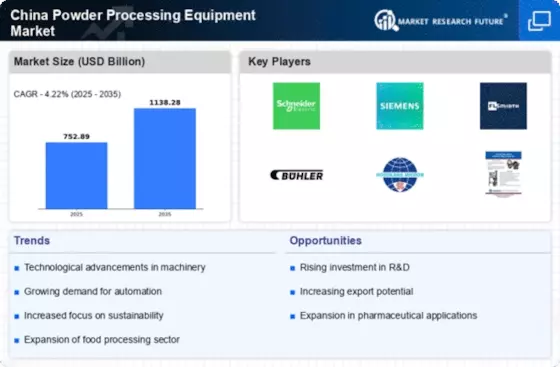 The increasing stringency of environmental regulations in China is likely to influence the China Powder Processing Equipment Market. The government has implemented various policies aimed at reducing emissions and promoting sustainable manufacturing practices. As a result, manufacturers are compelled to invest in eco-friendly powder processing technologies that minimize waste and energy consumption. In 2025, it is projected that the market for environmentally compliant processing equipment will grow by approximately 15%. This shift towards sustainability not only aligns with national goals but also enhances the competitiveness of manufacturers in the global market. Consequently, the demand for innovative and sustainable powder processing solutions is expected to rise, further driving the China Powder Processing Equipment Market.