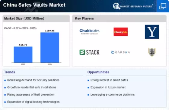 The China Safes Vaults Market is experiencing a surge in technological innovations, particularly in smart safe solutions. These safes are equipped with advanced features such as biometric locks, mobile app integration, and remote monitoring capabilities. The integration of Internet of Things (IoT) technology allows users to manage their safes from anywhere, enhancing convenience and security. As of 2025, the market for smart safes in China is projected to grow at a compound annual growth rate (CAGR) of approximately 15%. This trend indicates a shift towards more sophisticated security solutions, appealing to both residential and commercial sectors. The demand for technologically advanced safes is likely to drive the overall growth of the China Safes Vaults Market, as consumers increasingly prioritize security and ease of access.