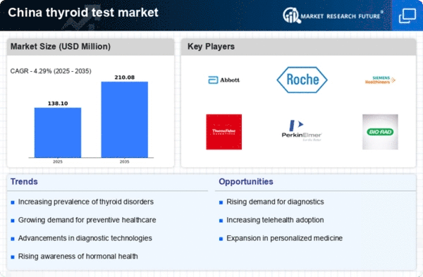 Government initiatives aimed at improving healthcare access and quality in China significantly influence the thyroid test market. Policies promoting preventive healthcare and regular screenings are being implemented, which encourages individuals to undergo thyroid testing. The Chinese government has allocated substantial funding to enhance healthcare infrastructure, particularly in rural areas, where access to diagnostic services has historically been limited. This investment is likely to facilitate the growth of the thyroid test market by increasing the availability of testing facilities and resources. Additionally, public health campaigns aimed at educating citizens about thyroid health are expected to further drive demand for testing services.